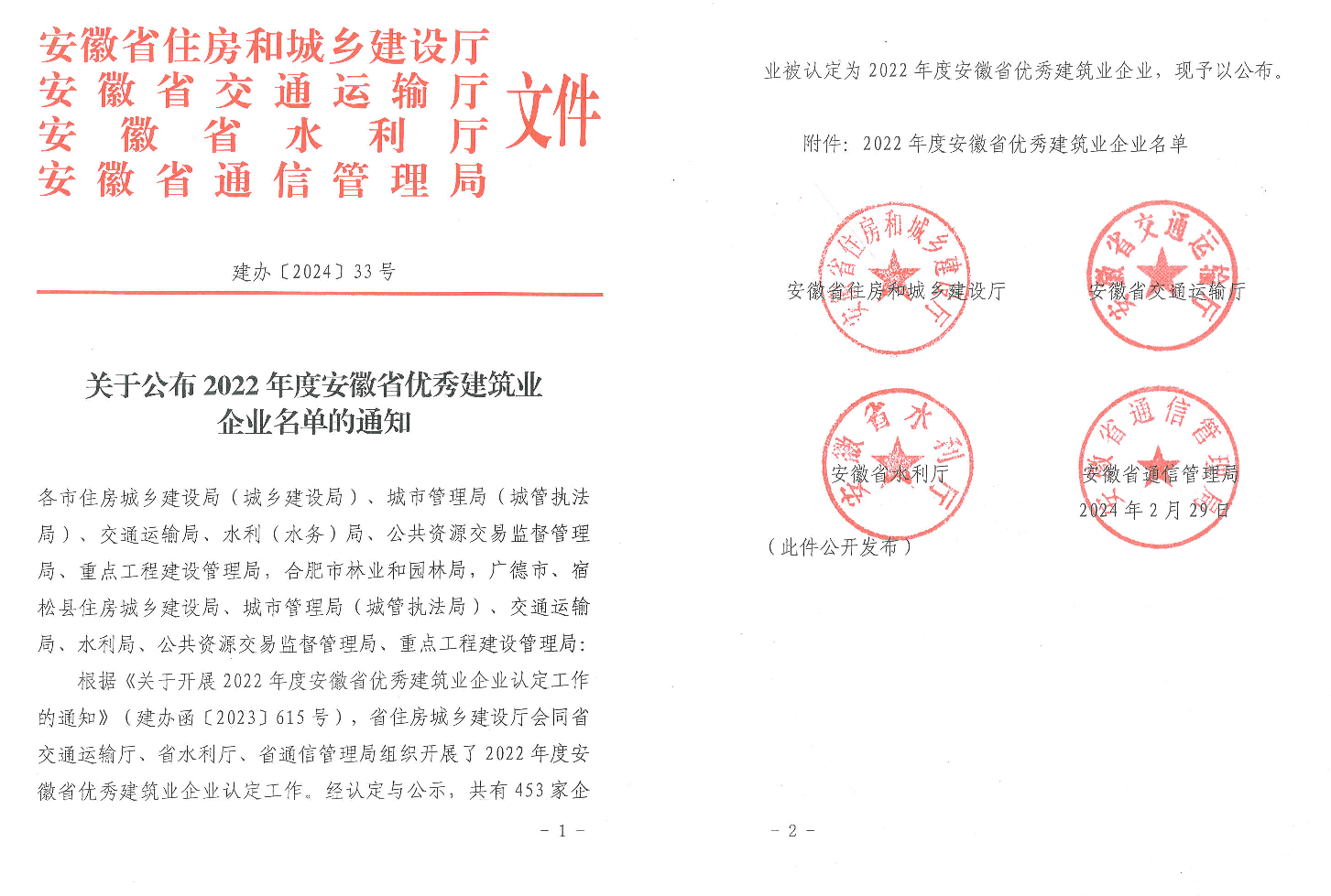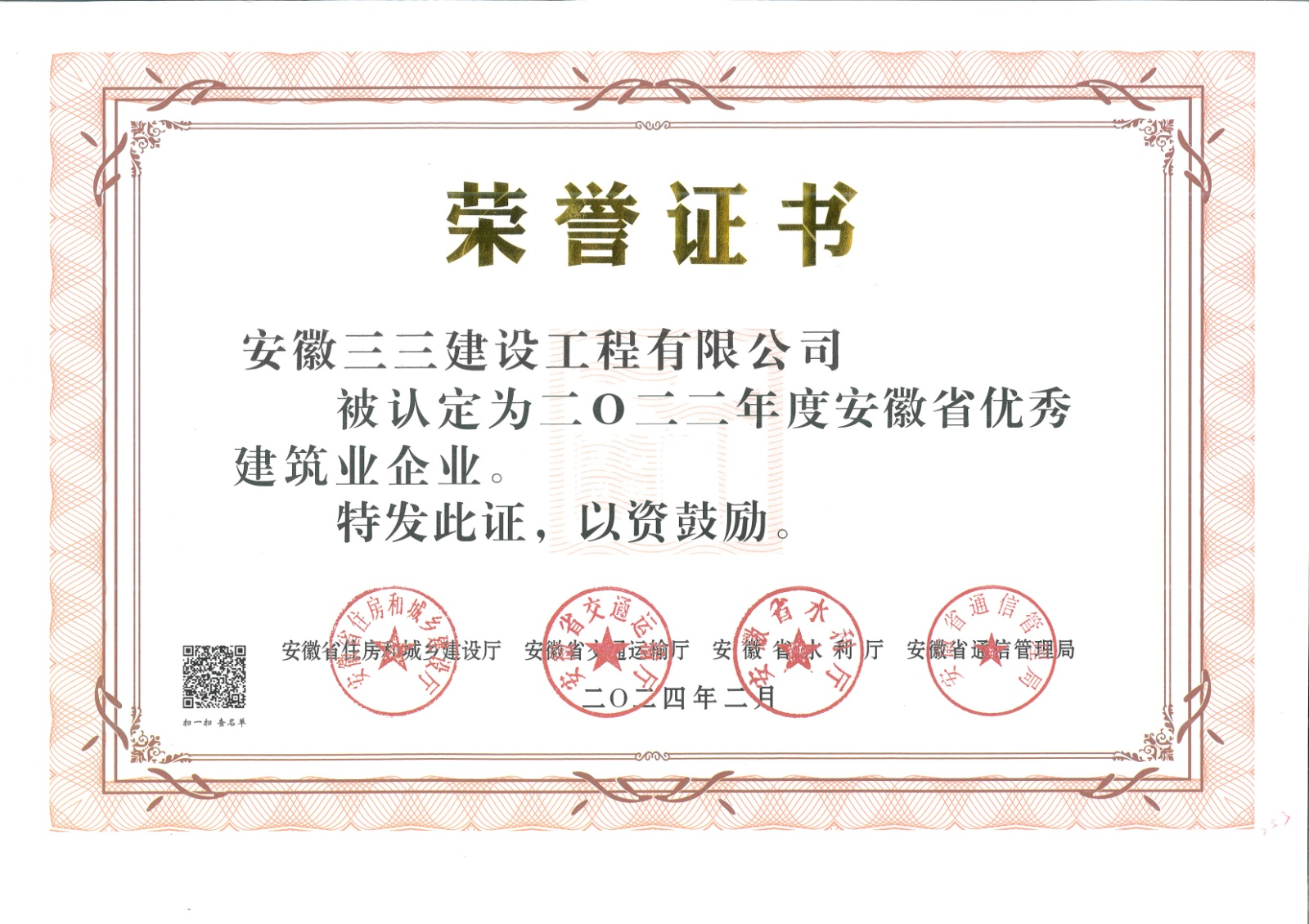 近日,安徽省住房和城鄉建設廳發布了《關于公布2022年度安徽省優秀建筑業企業名單的通知》(建辦〔2024〕33號),三三建設憑借經營發展、管理創新、工程質量等方面的優異表現再次名列榜單。這也是自2020年“安徽省優秀建筑業企業”開展認定工作以來,三三建設連續三年榮獲該項榮譽。