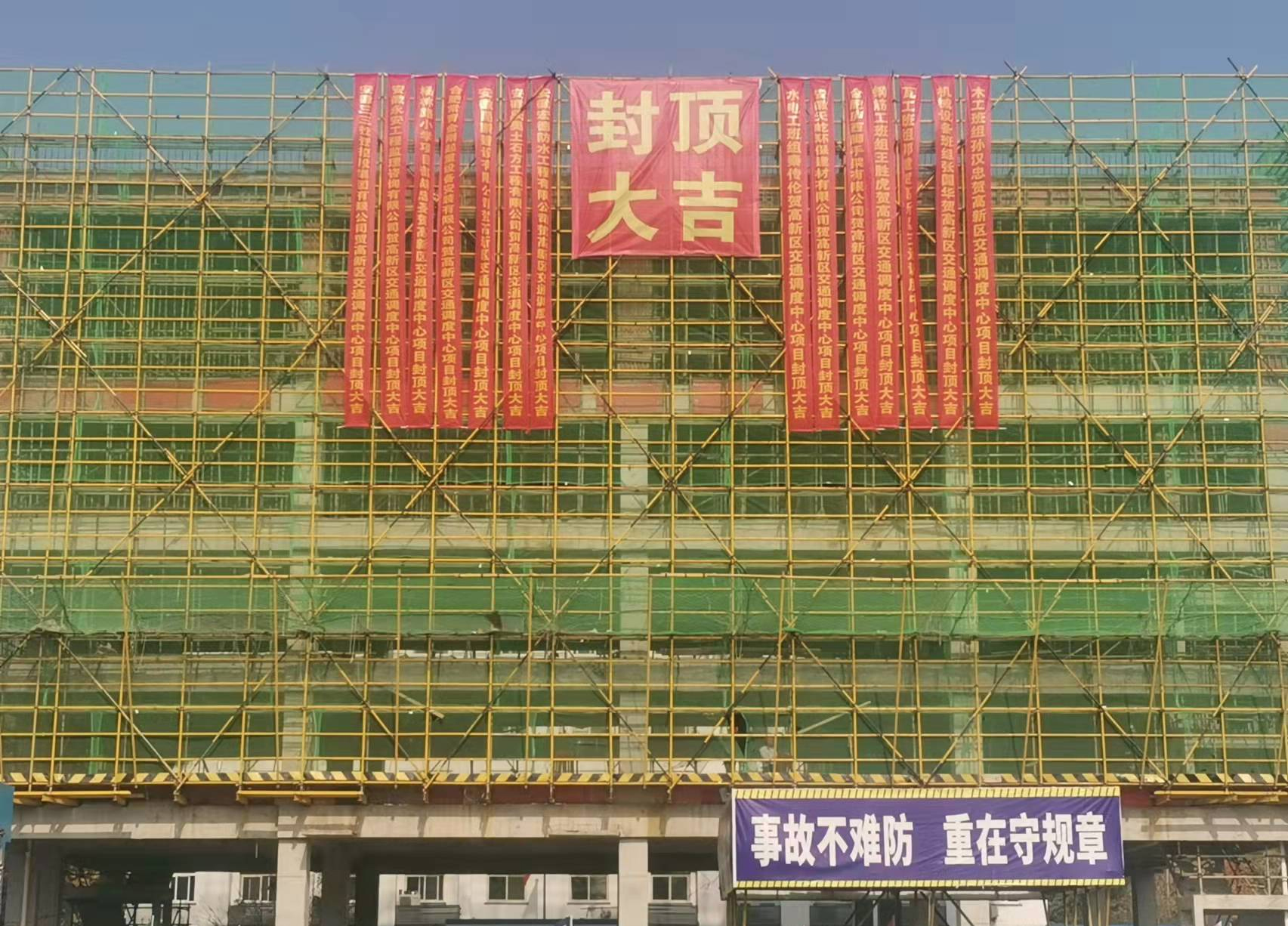 高新區交通調度中心項目位于合肥市高新區望江西路與楓林路交叉口東南側,是合肥市高新區的重點公共服務設施項目,建筑高度為22.50m,地上5層,地下1層;總用地面積約為2265.6㎡,總建筑面積為4000.38㎡,其中地上建筑面積為3186.39㎡,地下建筑面積為813.99㎡。該項目建成后將整體移交給合肥市公安局交警支隊高新區大隊作為高新區交通應急指揮中心使用,以便于滿足合肥市高新區日益增長的交通保障需求。該項目自2021年8月19日開工以來,在公司領導的高度重視和項目部全體成員的共同努力下,嚴格按照施工方案,緊抓項目質量和工程進度,克服工期緊、物料漲價等因素影響,順利迎來主體結構封頂。